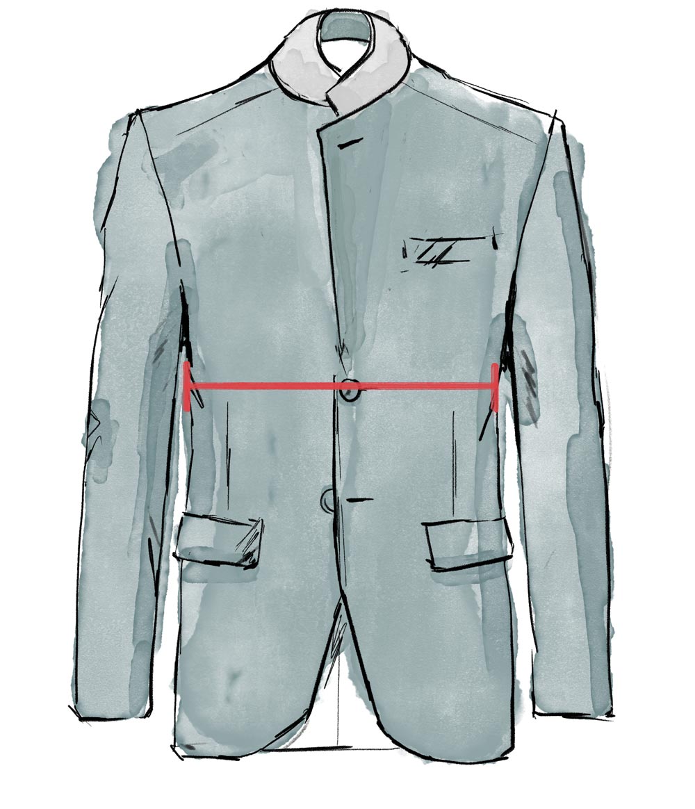 Beim 2-Knopf-Sakko den oberen, beim 3-Knopf-Sakko den mittleren Knopf schließen. Kragen nach oben schlagen, Revers umklappen und Sakko glatt auf einen Tisch legen. Auf Höhe des geschlossenen Knopfes die Breite des Sakkos messen.